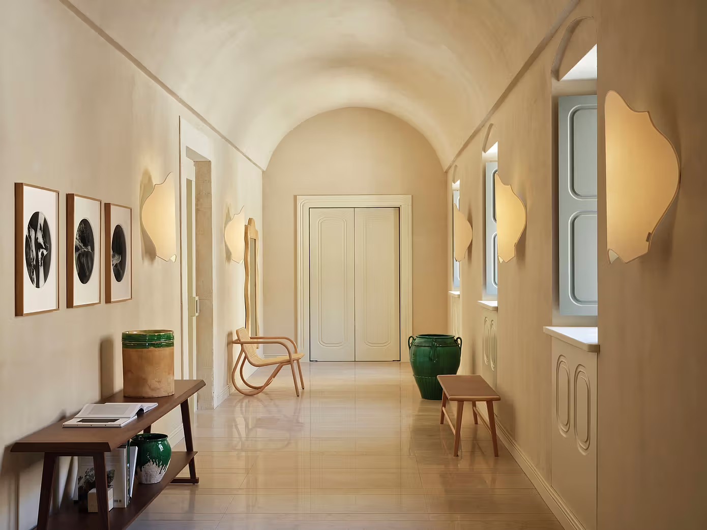 The hotel preserves the original architectural features of the factory, such as the stone vaults and semi-arched ceilings (locally known as “volta a schifo”), while restoring courtyards, doors, and windows to breathe new life into the building. During the renovation, local artisans played a crucial role, re-carving cornices, repairing exterior walls, and using stone and marble from nearby quarries for flooring and terraces.